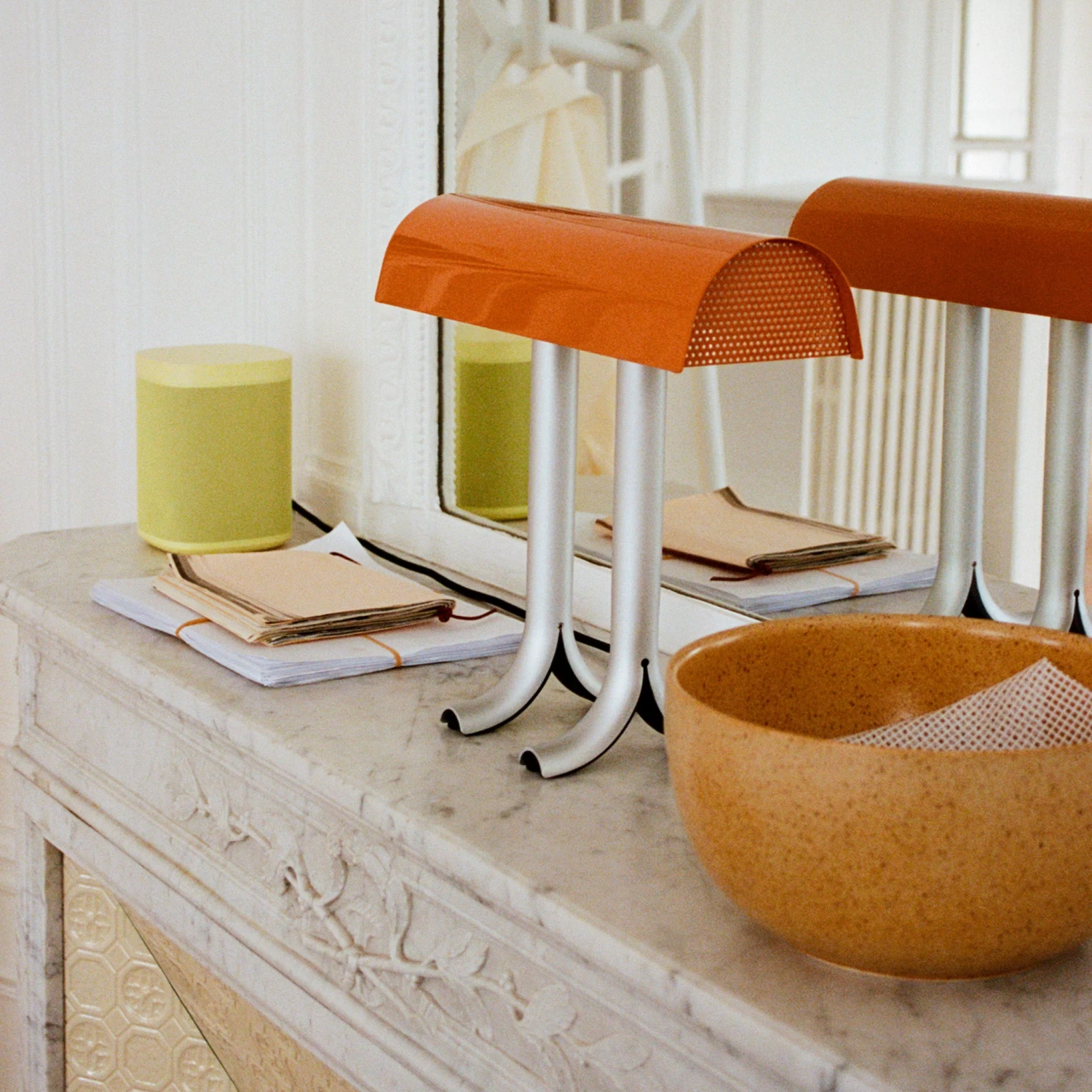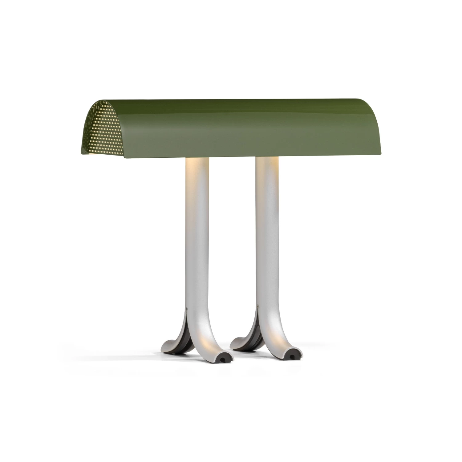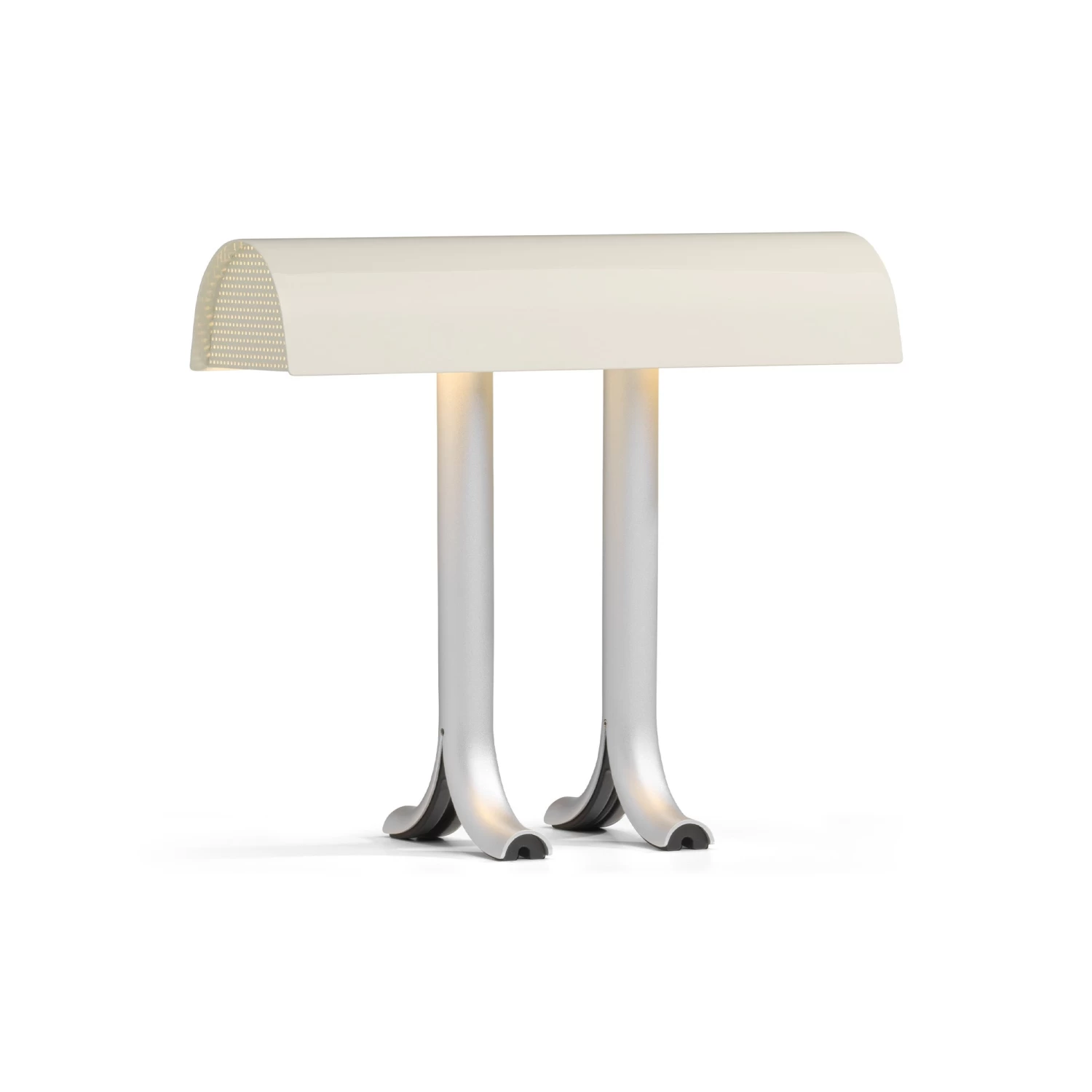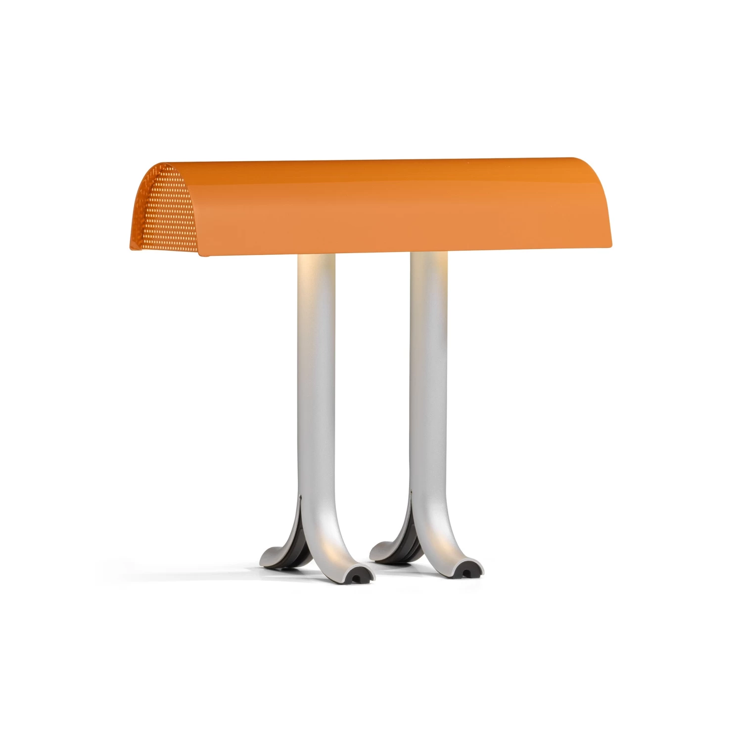 The result is a generously curved, glossy shade that sits atop two split anodised aluminium legs, with the contrasting elements updating the familiar lamp typology with an original and contemporary aesthetic.