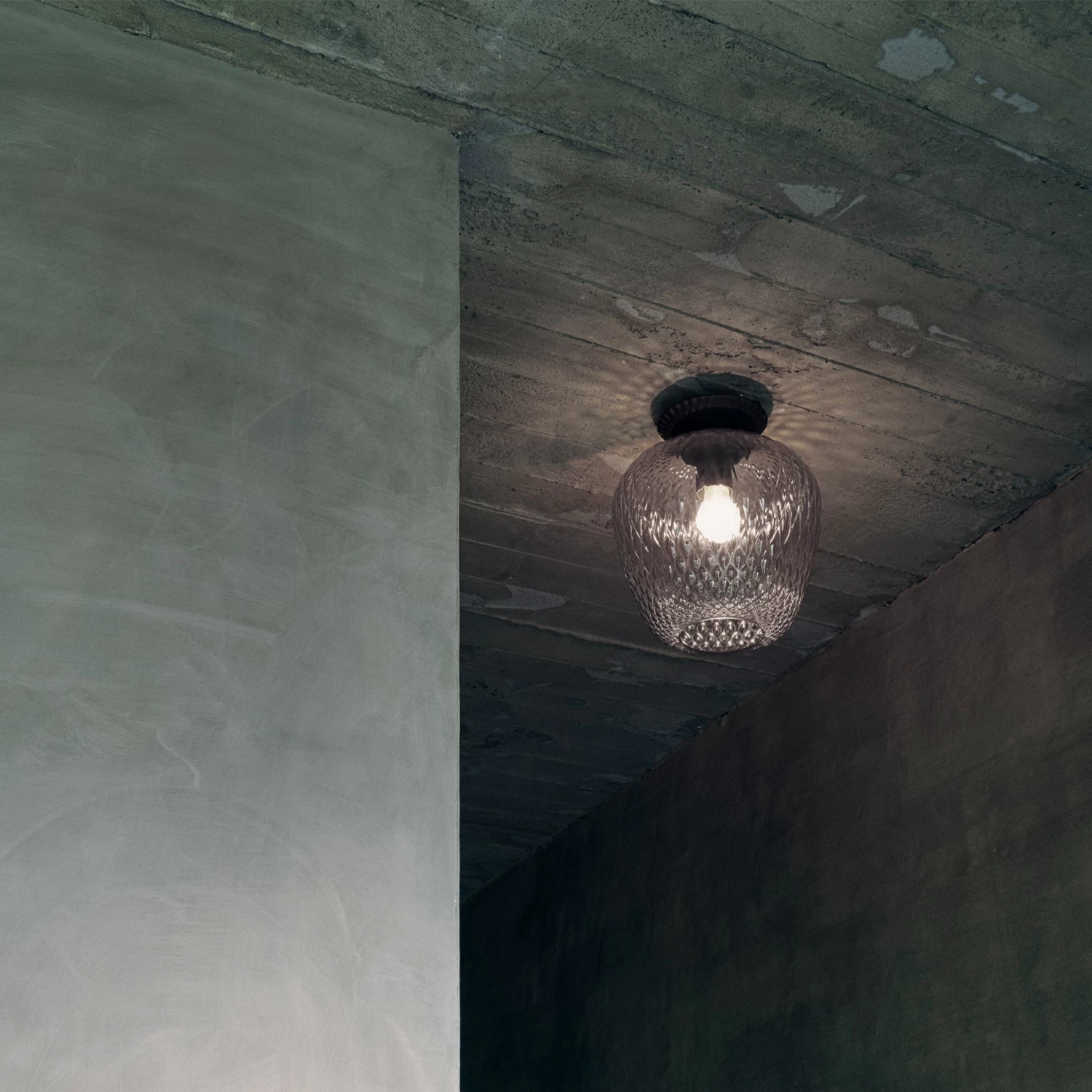 While experimenting with the reflections and refraction of light, designer Samuel Wilkinson discovered a beautiful quilted effect when the light source was surrounded by patterned glass.Â