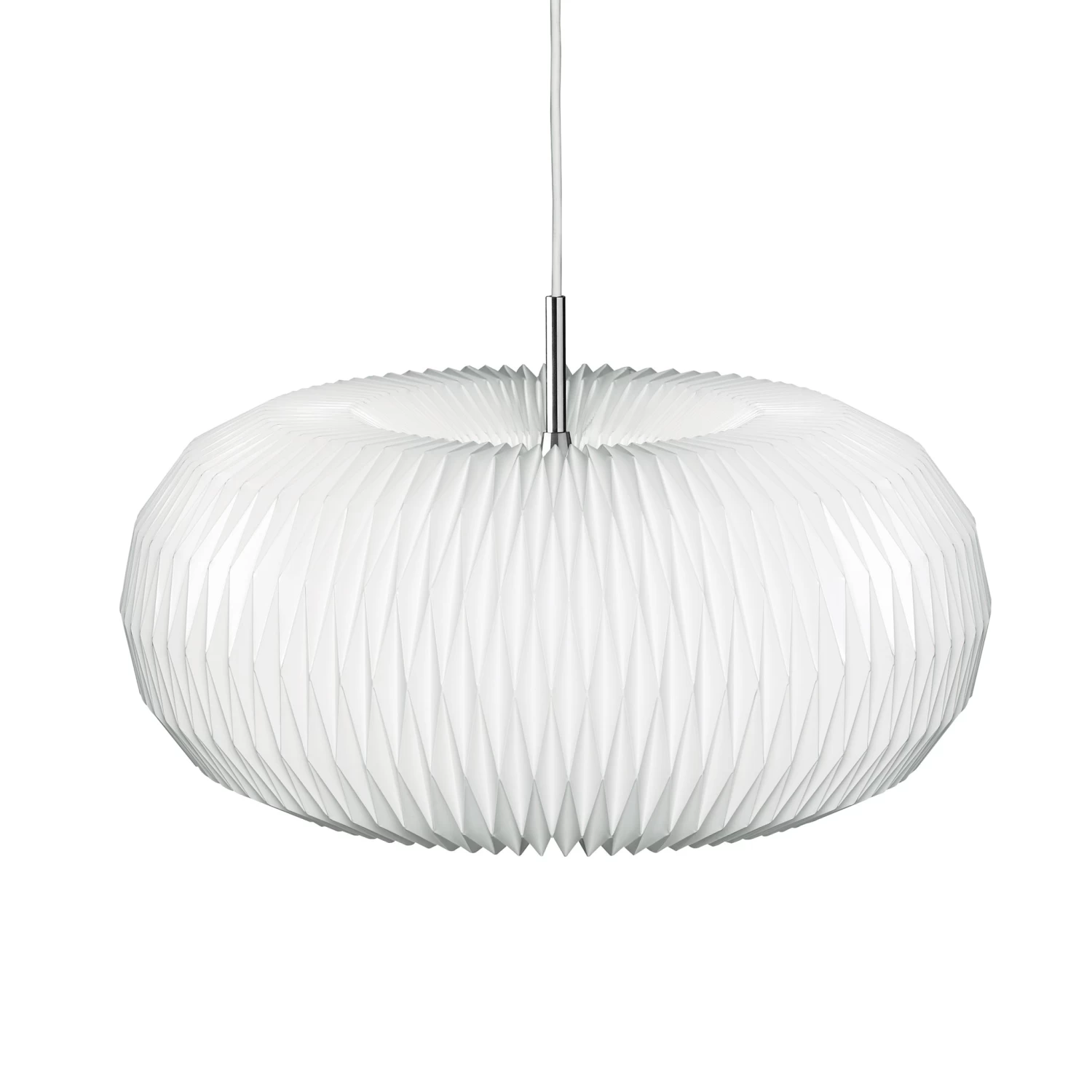 Lamp model 195Â is popularly known as the Donut lamp. When she created the lamp in 2007, designer Lise Navne was in fact inspired by the rounded shape of its edible counterpart. The lamp is completely enclosed at top and base by a polished steel plate, the simplicity of which is in perfect contrast to the very complex pleating of the lampshade itself.