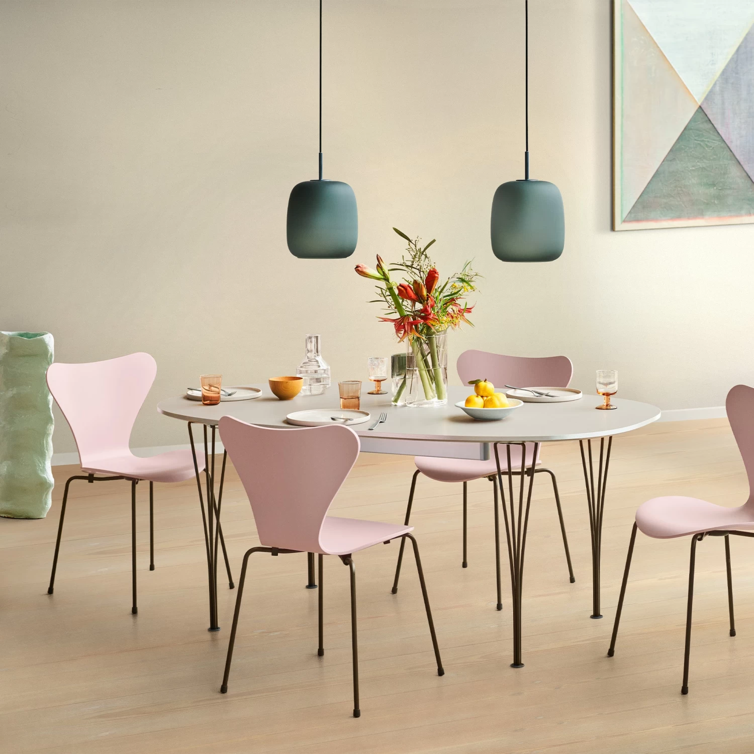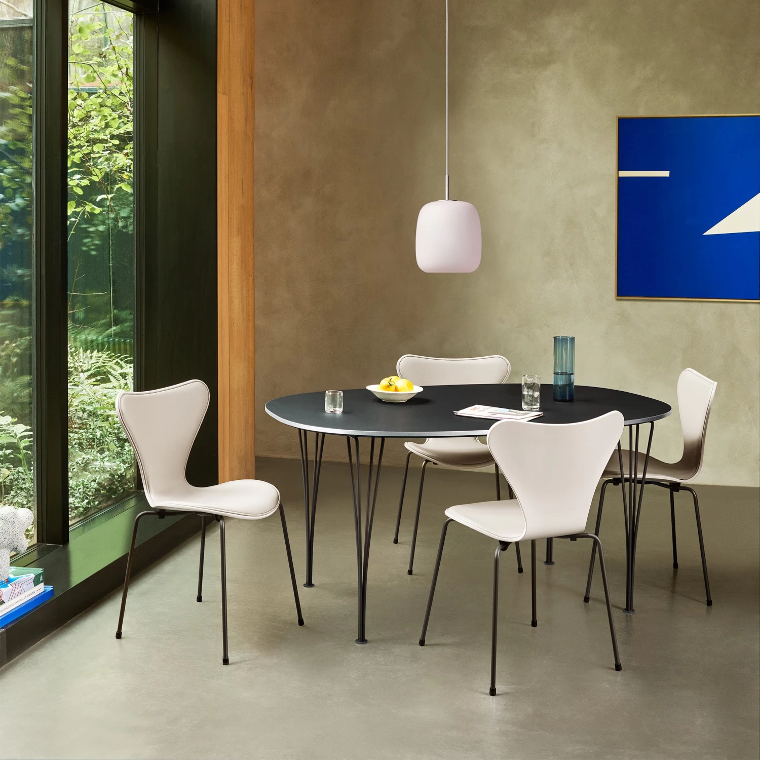 Maluma – a design term for round and soft – features coloured, smooth frosted hand-blown glass. Available in delicate rose, deep plum, and earthy moss, the pendant adds soft colour to any room. Left off or lit, it keeps its colour giving both soft ambient light and functional downlight from its open bottom.