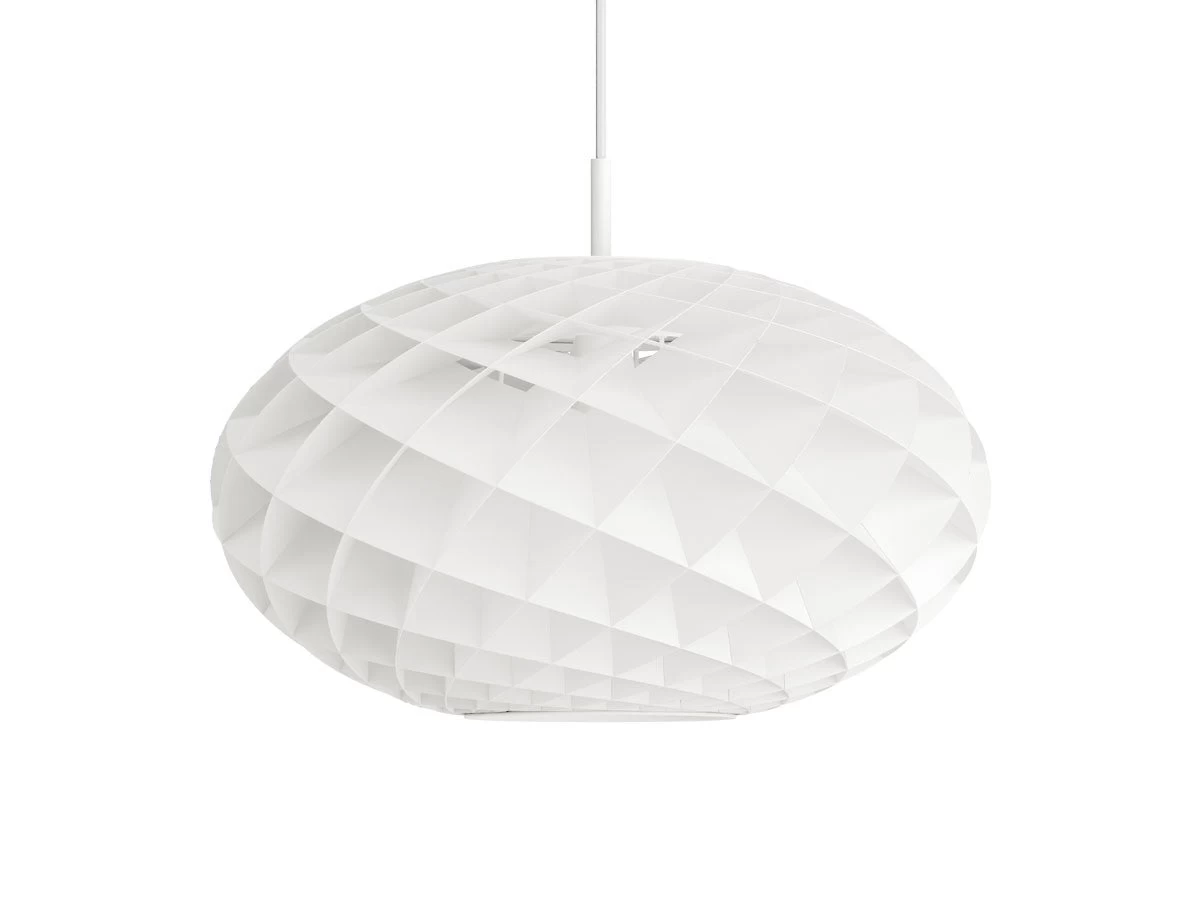 Shade made from cut matt PVC, with suspension in white, opal, matt coated, injection moulded polycarbonate. White textile cable.
