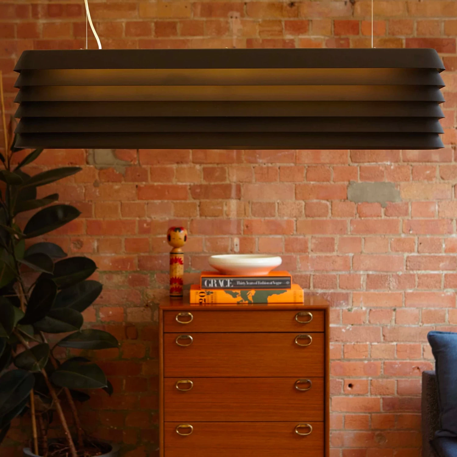 Referencing window blinds and ‘muscle cars’, Klauser & Carpenter’s surprisingly understated Louvre design uses layers of pressed aluminium to create a glare-free, ambient light.