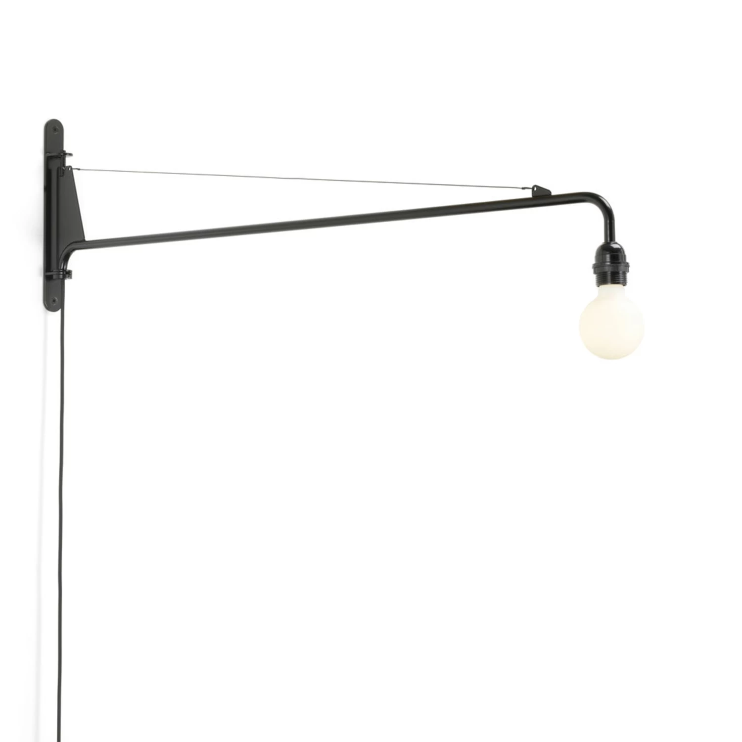 Jean Prouvé created the first version of the Potence wall lamp in the 1940s for his own home in Nancy: a simple light bulb affixed to a long, pivoting steel bar, which is held by a steel wire. This functionalist, puristic design was soon produced in various sizes, with an added handle on larger models to facilitate the swivel movement.