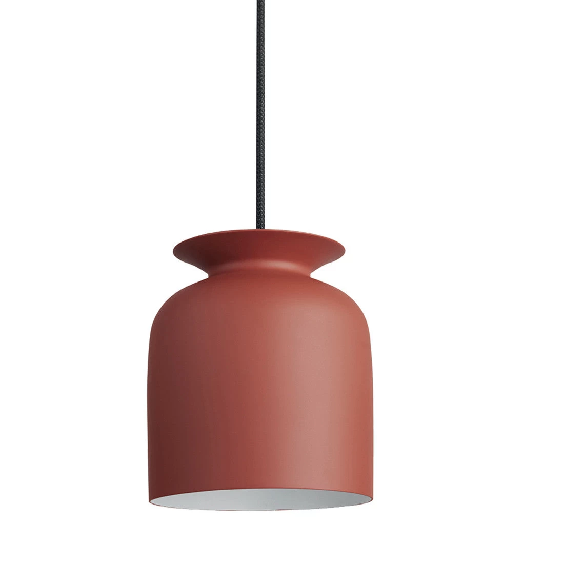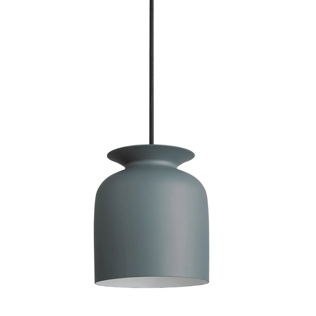 Ronde has a pleasing bell shape with an opening at the top with an overhanging collar. The mainly downwards directed light from conventional pendant lamps does in this design also spread out of the spout-like opening and casts a smooth light gradient at the wire and ceiling. The hand-turned aluminium lamp shade with an ultra-matt lacquer has a ceramic like appearance.