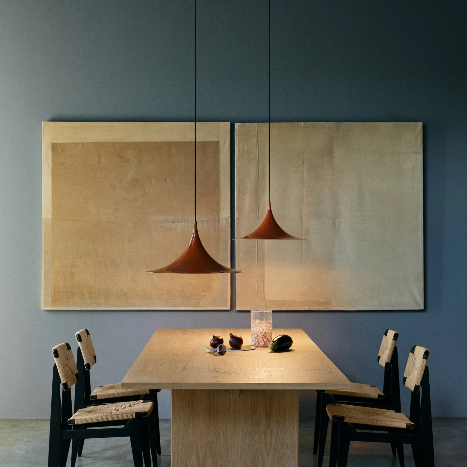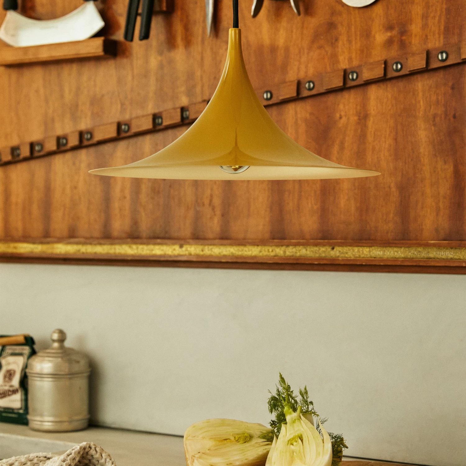 The Semi Pendant is a unique pendant lamp, based on two quarter-circles put together, back-to-back. It’s distinctive arch-shaped, enamelled metal shade creates a diffused, cone-shaped light, ideal over a dining table or kitchen work surface.